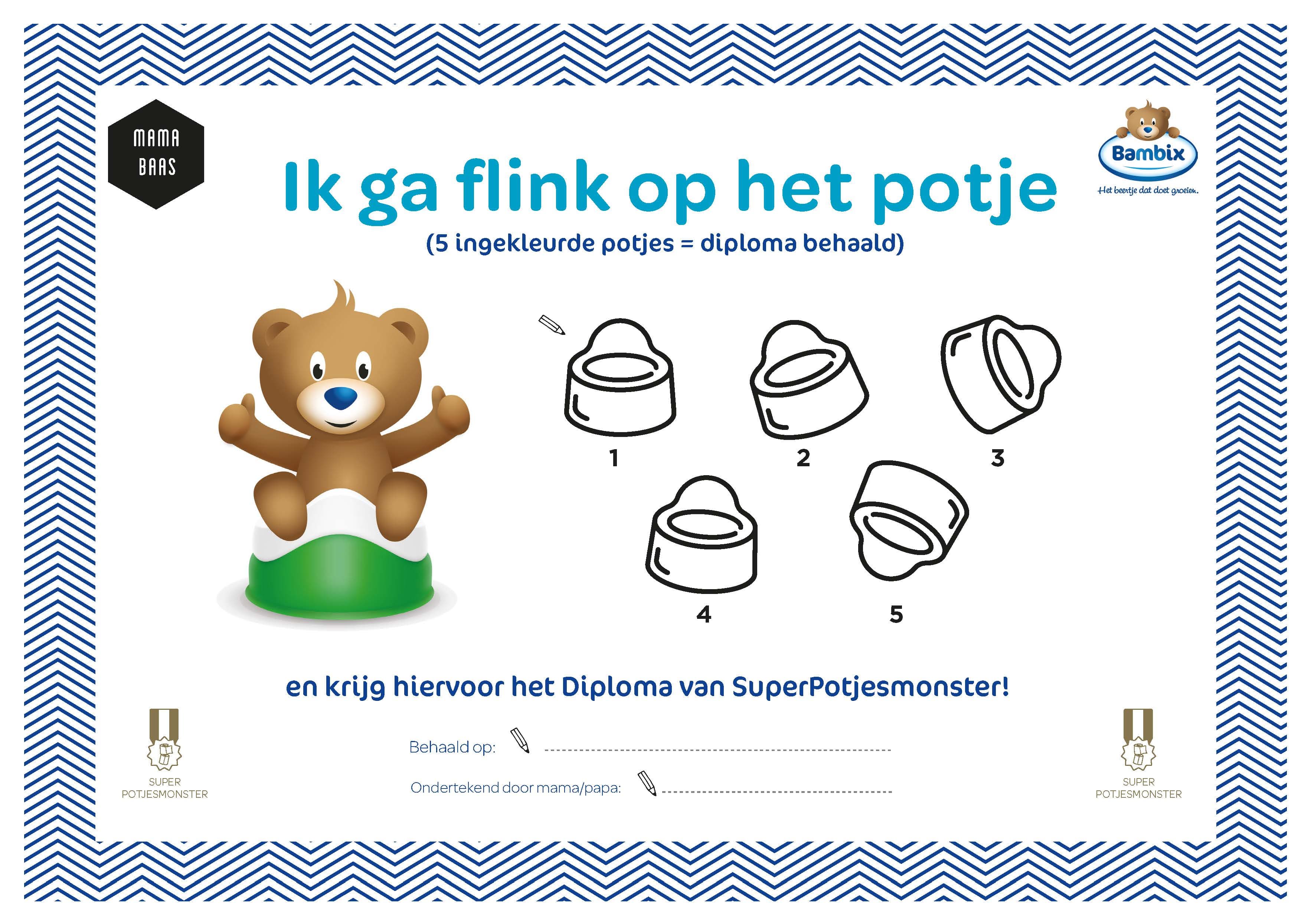 Print het uit en vul het samen met uw kind in wanneer hij/zij flink op het potje is geweest. Na 5 ingevulde vakjes krijgt uw kind het diploma van SuperPotjesmonster!