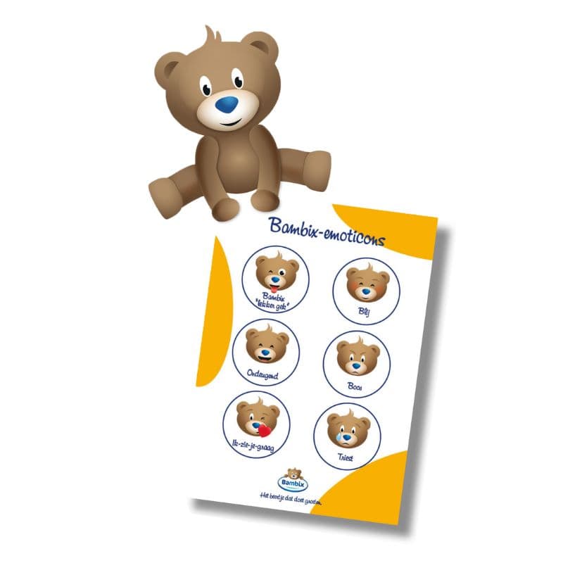 Print de Bambix-emoticons af en bespreek ze samen met je kind. Laat je zoon of dochter zelf situaties bedenken waarin elk beertje van toepassing is. Boos, blij, verdrietig of net opgewonden? Hoe voel jij je? Misschien stiekem wel lekker een beetje gek en zin in avontuur? Dan voel je je helemaal Bambix!